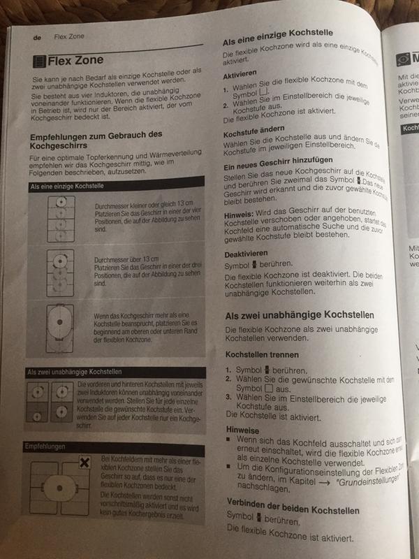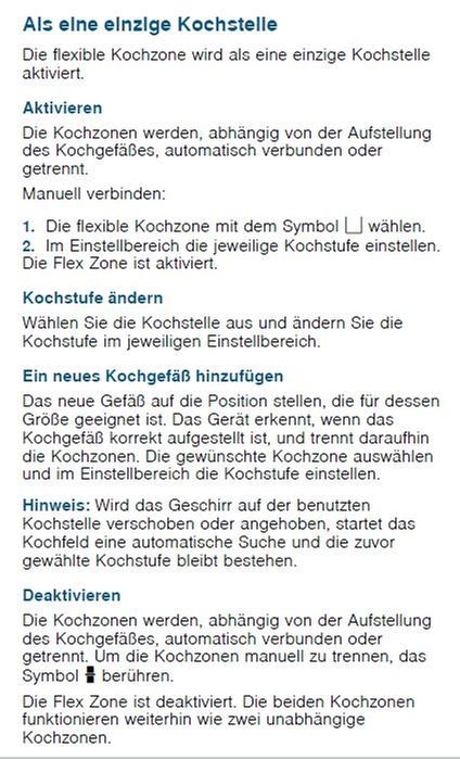 Hallo zusammen, Siemens wirbt bei diesem Kochfeld stark mit der Funktion varioInduktion Plus. In der Praxis ist es nicht einmal möglich auf einer Seite eine große Pfanne (welche über drei Induktoren reicht) und einen kleinen Topf (welcher auf dem vierten Induktor steht) getrennt voneinander auf zu heizen. Siemens verschwendet bei diesem Kochfeld sehr viel Platz. Effektiv kann dieses 80er Kochfeld nur mit einem 60er mithalten. Sehr schade. Zudem hat Siemens in der Bedienungsanleitung auf dieser Homepage die Flex Zone falsch beschrieben. (Siehe angefügtes Foto 1) Die Kochzonen werden bei diesem Kochfeld nicht automatisch verbunden oder getrennt. Dies geht nur manuell. So ist es auch in der mitgelieferten Anleitung beschrieben. (Siehe angefügtes Foto 2) Ich weiß nicht ob dies eine absichtliche Irreführung sein soll oder ob einfach nur die Bedienungsanleitung falsch zusammengestellt worden ist. Ich hatte mich sehr auf die automatische Funktion über die Trennung und Zusammenführung der Kochzonen gefreut. Somit passen sich leider nicht die Kochzonen automatisch an die Größe der Töpfe an.