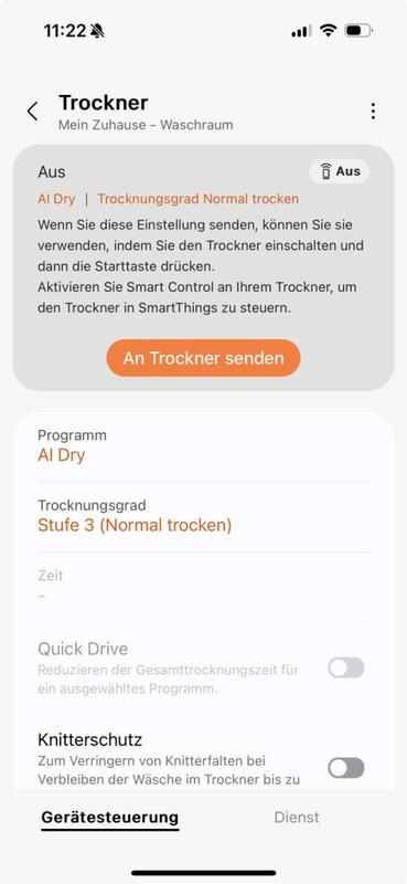 Trocknen Sie Ihre Wäsche einfach und effizient zugleich. AI Control mit informativem Textdisplay merkt sich Ihre Trockengewohnheiten, schlägt Ihnen die passenden Trockenprogramme vor* und hält Sie mit aktuellen Informationen auf dem Laufenden. Nachrichten mit Vorschlägen zu Waschprogrammen werden auf einer Smartphone App angezeigt. Die Smart Things App berät Sie, unterstützt Sie bei der Wäscheplanung und hilft, sollten einmal Probleme auftreten. Die App ist verfügbar für Android- und iOS-Geräte. Eine Wi-Fi-Verbindung und ein Samsung Account sind erforderlich. Über Auto Cycle Link stellt sie zudem den Trockengang für Ihre frisch gewaschene Wäsche automatisch ein. Auto Cycle Link ist nur verfügbar, wenn sowohl die Waschmaschine als auch der Trockner über AI Control verfügen und eine WiFi-Verbindung verfügen.